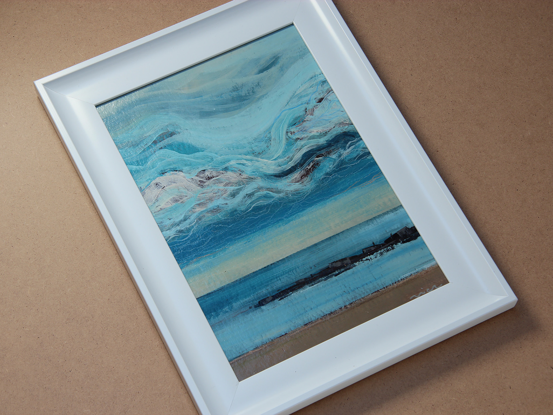 Pejzaż: Barcelona, plaża. Akryl na papierze zamocowany na sklejce. 21x30 cm. W ramce bez szyby.
