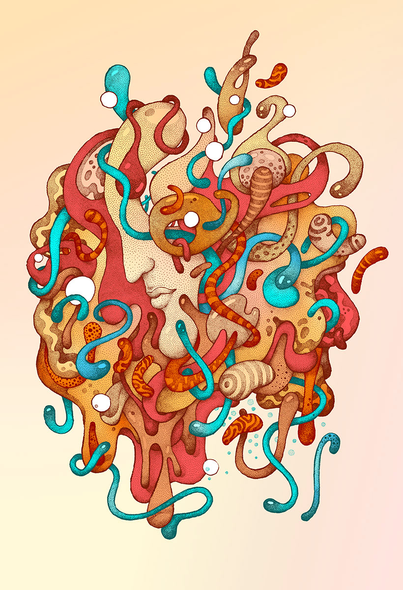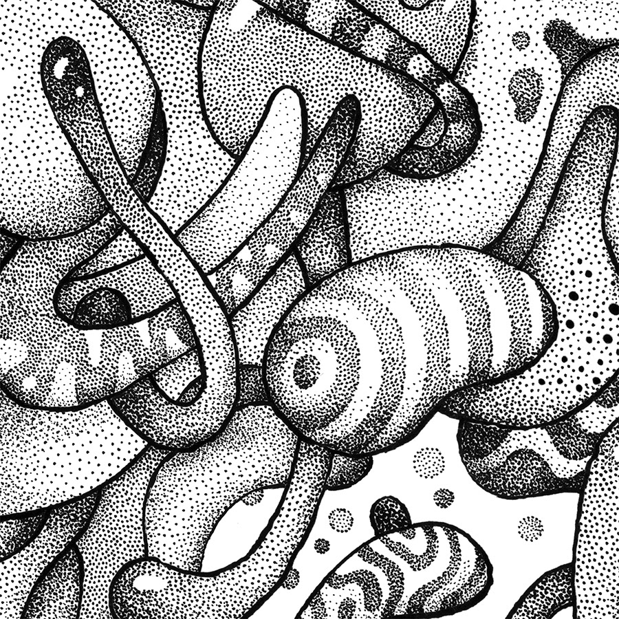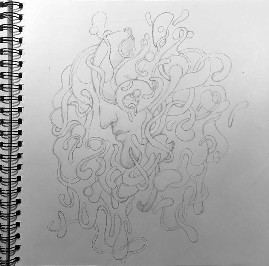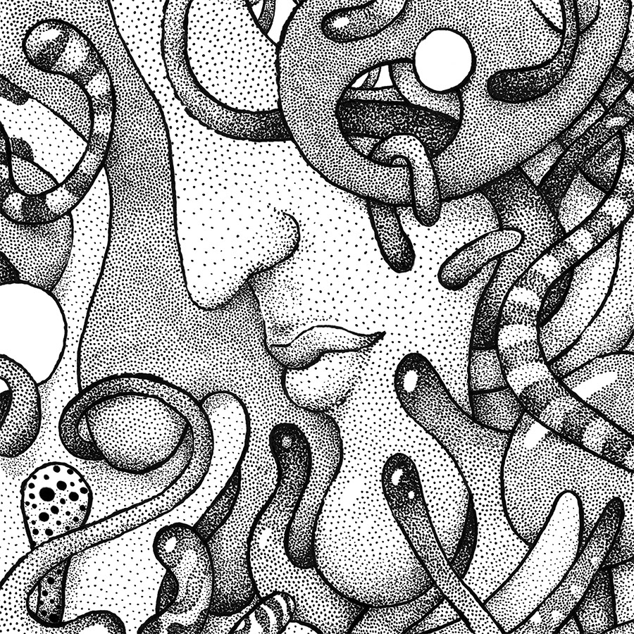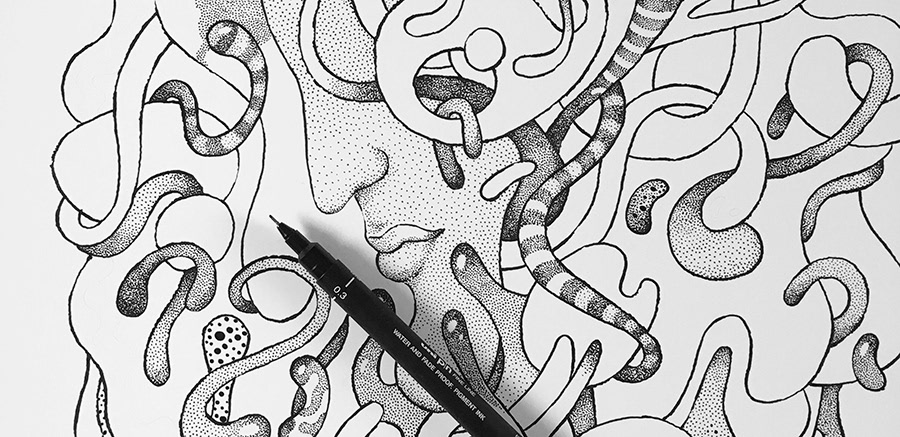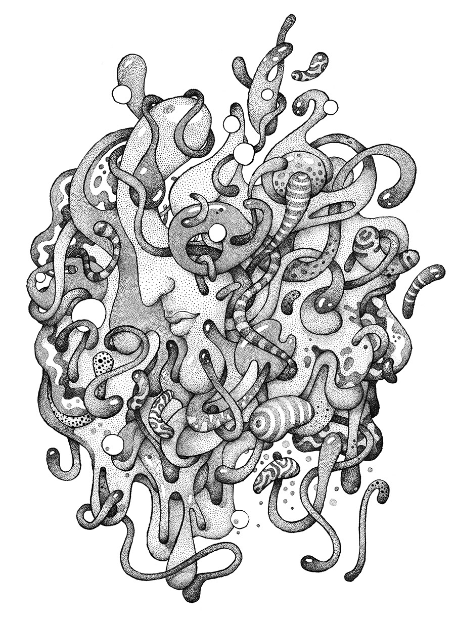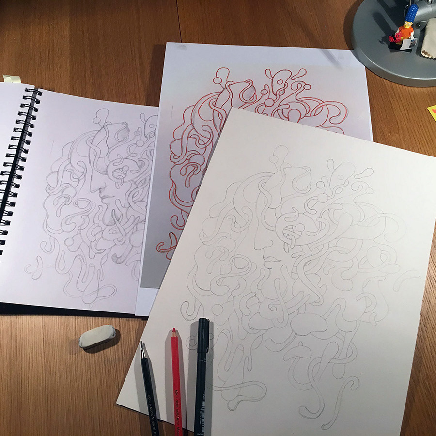 No. 10 in the series of drawings for "The Masks" personal project. Hand drawn with a brushpen and micron pens on an A3+ size paper.