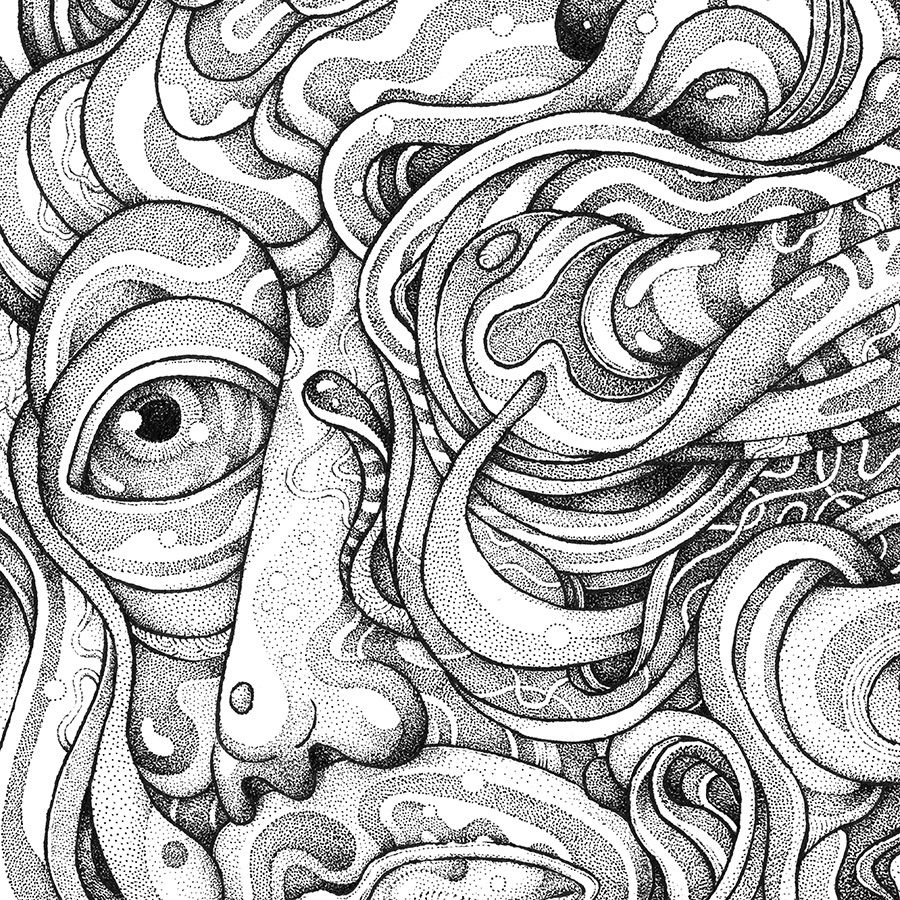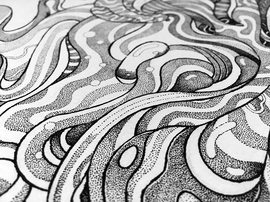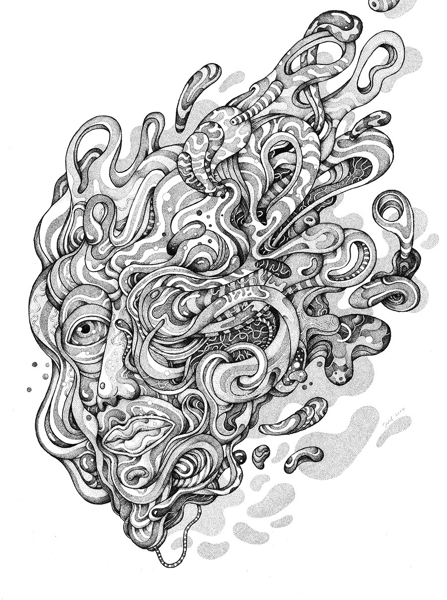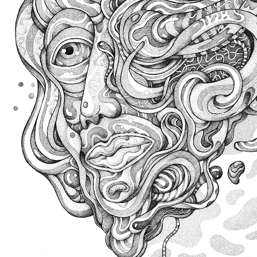 This is a part of my personal drawing project featuring a serie of fantasy and surreal faces/masks. Hand drawn with a brushpen and micron pens on an A2 size paper.