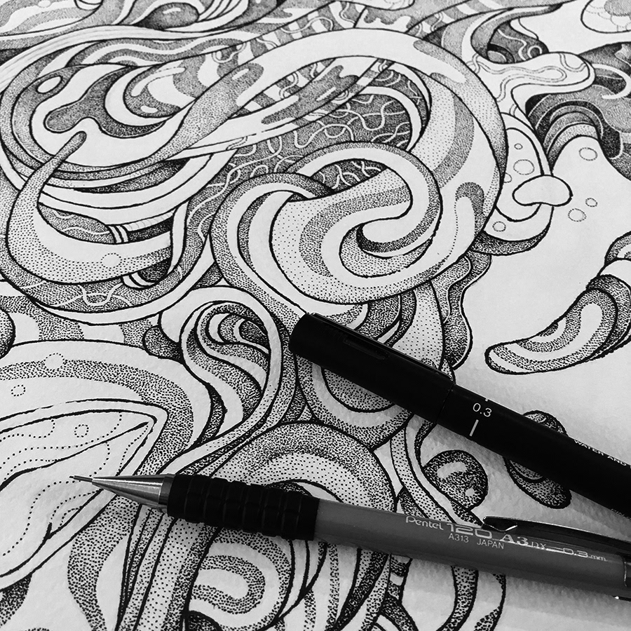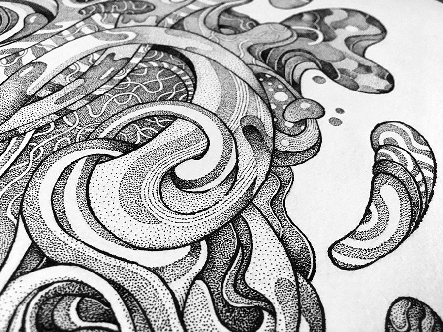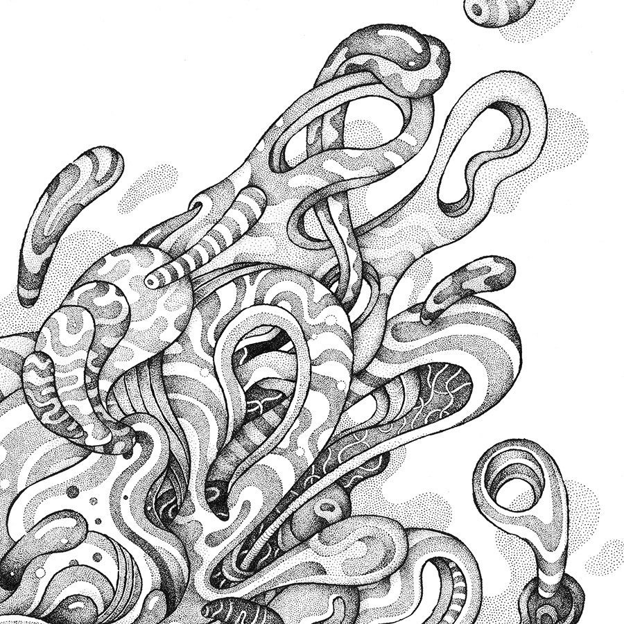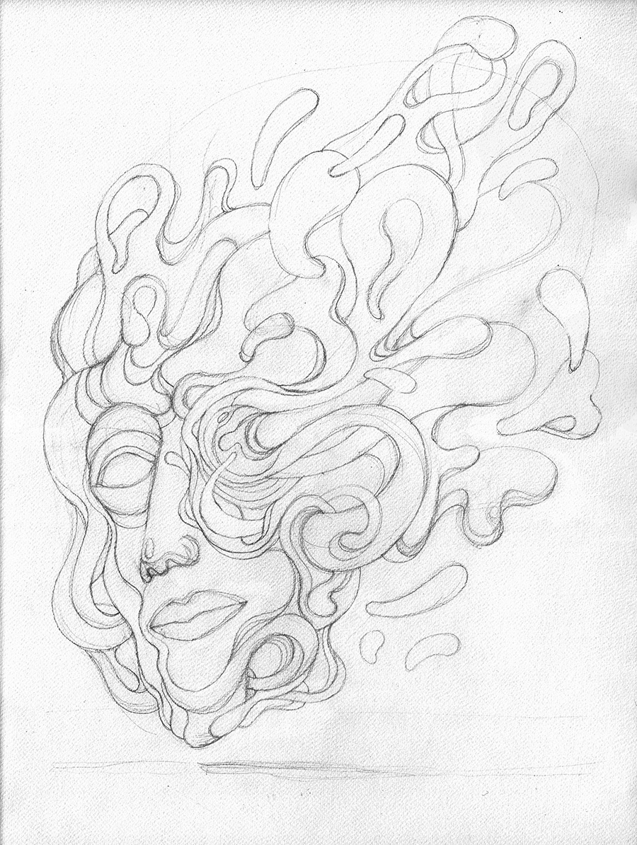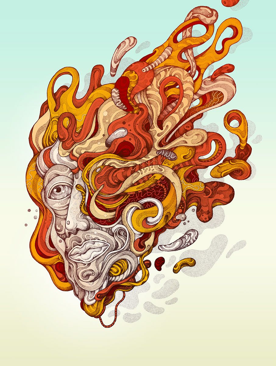 This is a part of my personal drawing project featuring a serie of fantasy and surreal faces/masks. Hand drawn with a brushpen and micron pens on an A2 size paper.
