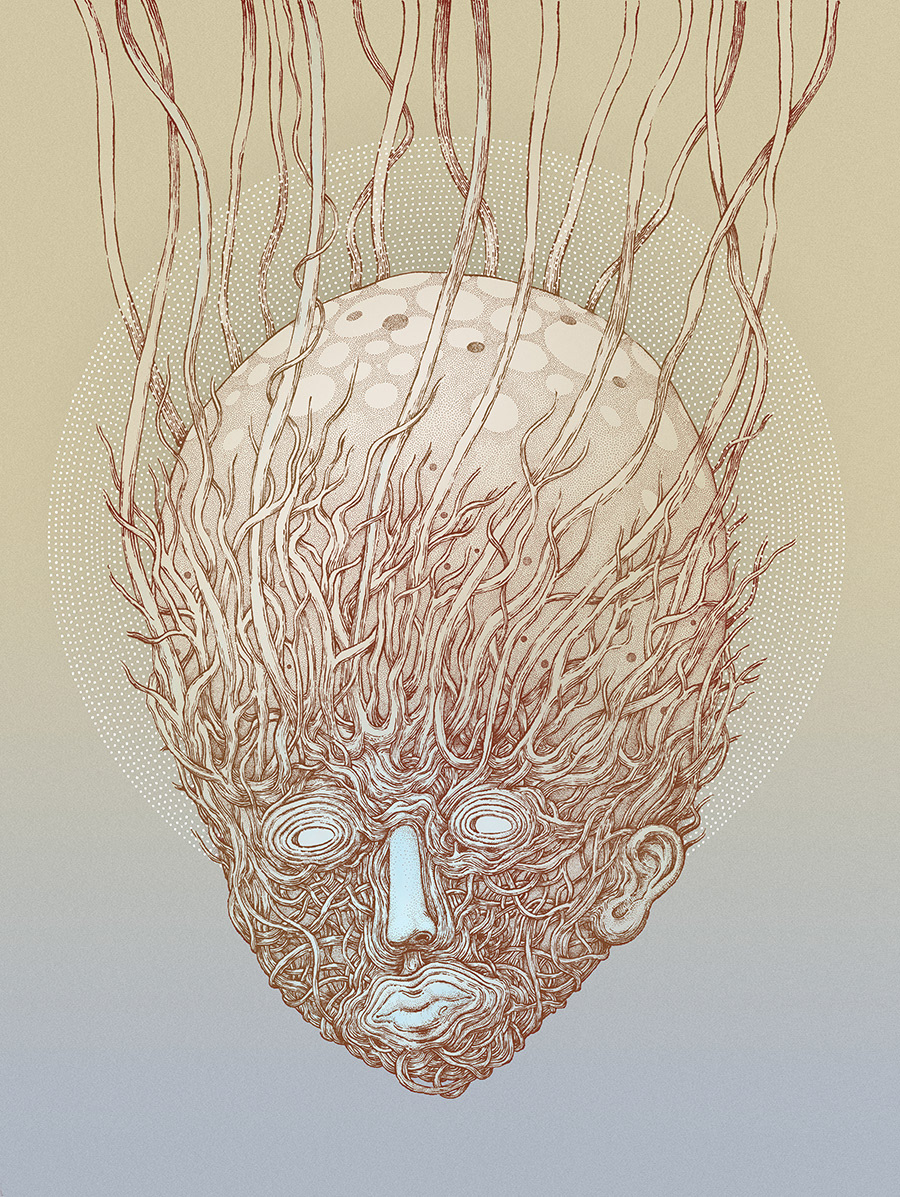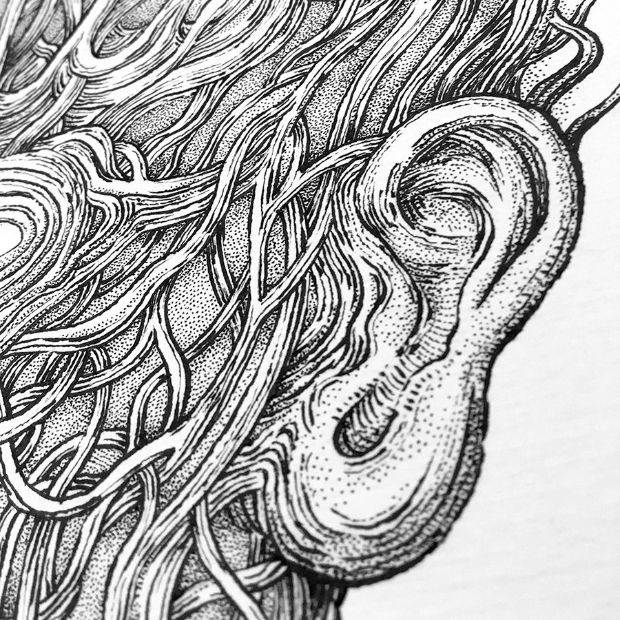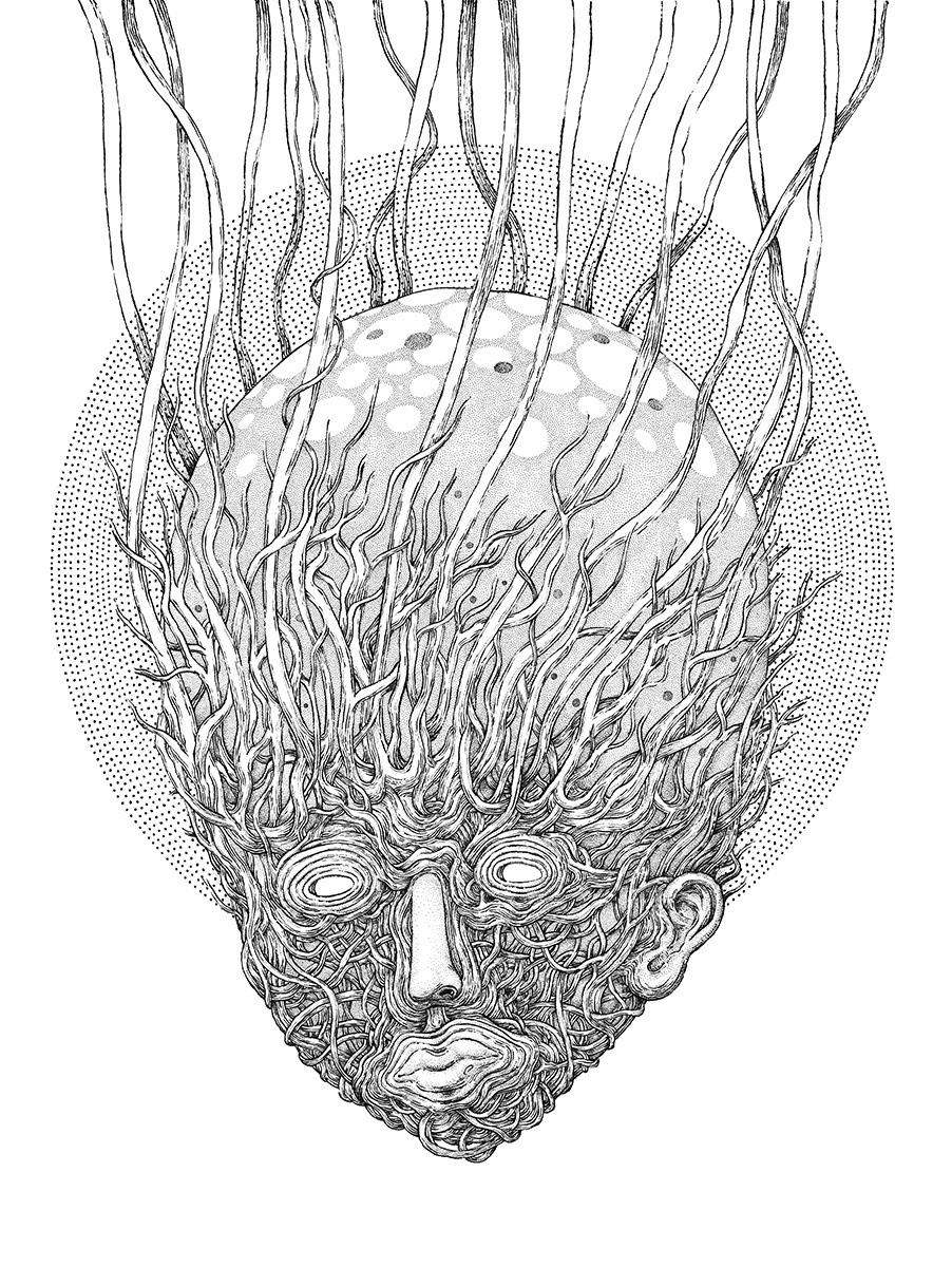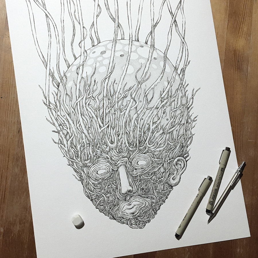 A part of my personal drawing project "The Masks" featuring a serie of fantasy and surreal faces/masks. Traditional analog drawing finished and colored in photoshop.