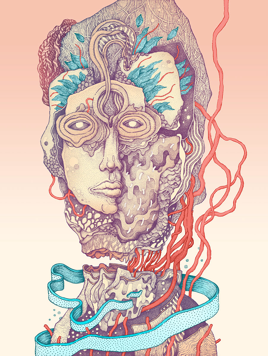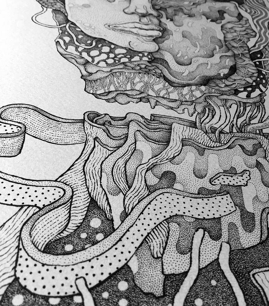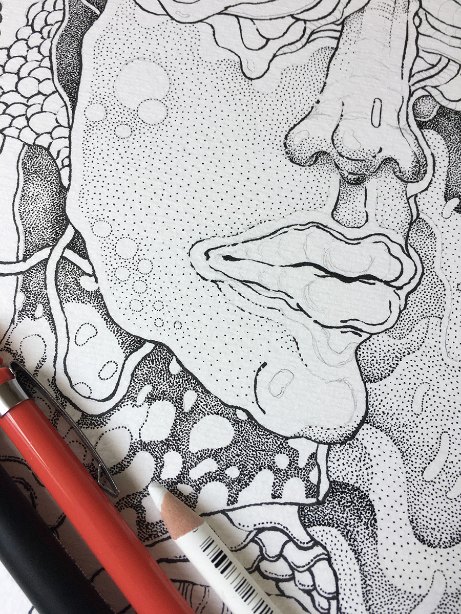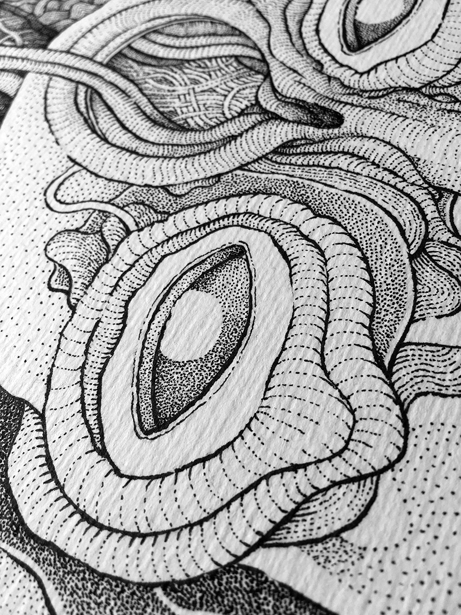 This is a part of my personal drawing project "The Masks" featuring a serie of fantasy and surreal faces/masks. Hand drawn with a brushpen and micron pens on an A2 size paper.