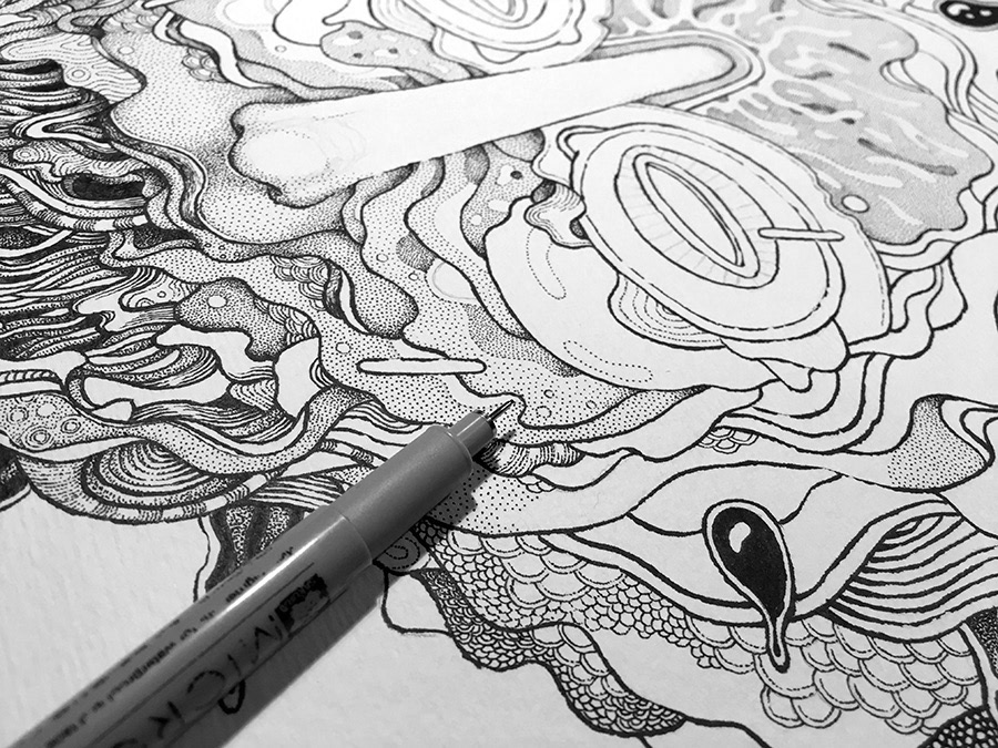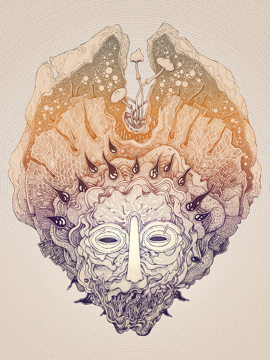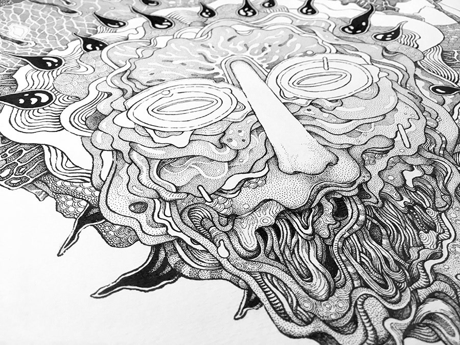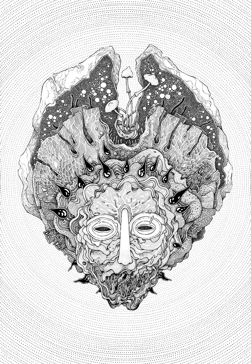 This is a part of my personal drawing project "The Masks" featuring a serie of fantasy and surreal faces/masks. Traditional analog drawing finished and colored in photoshop.