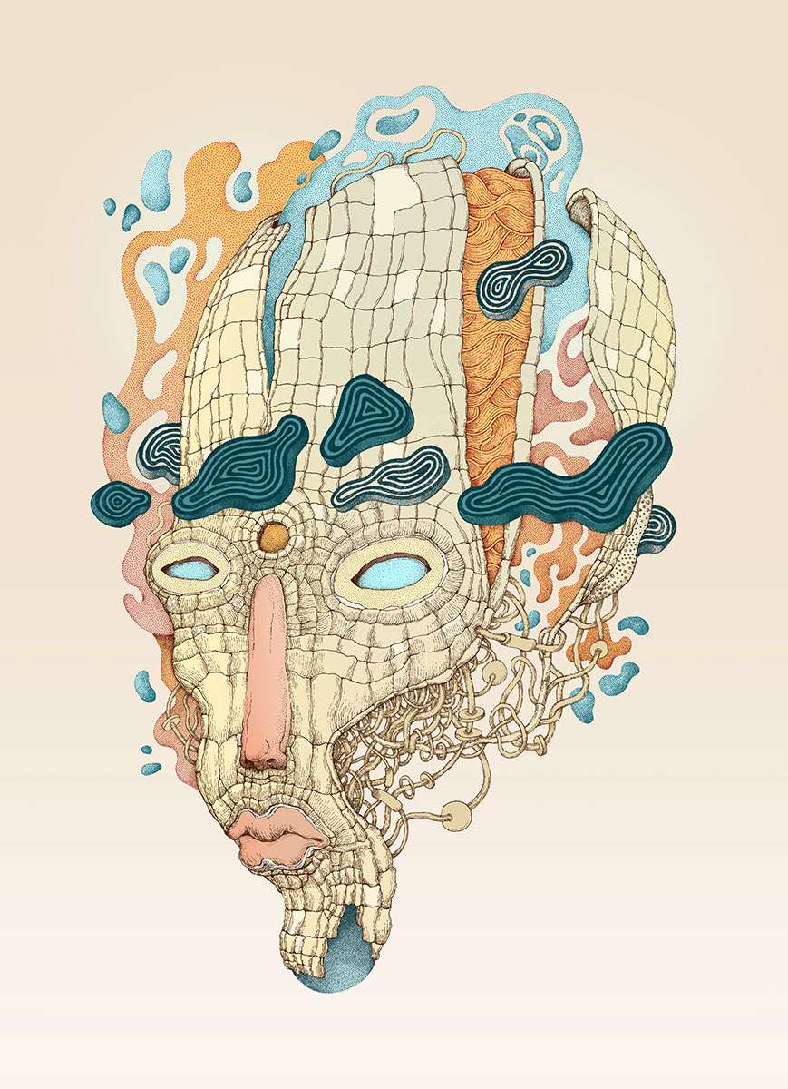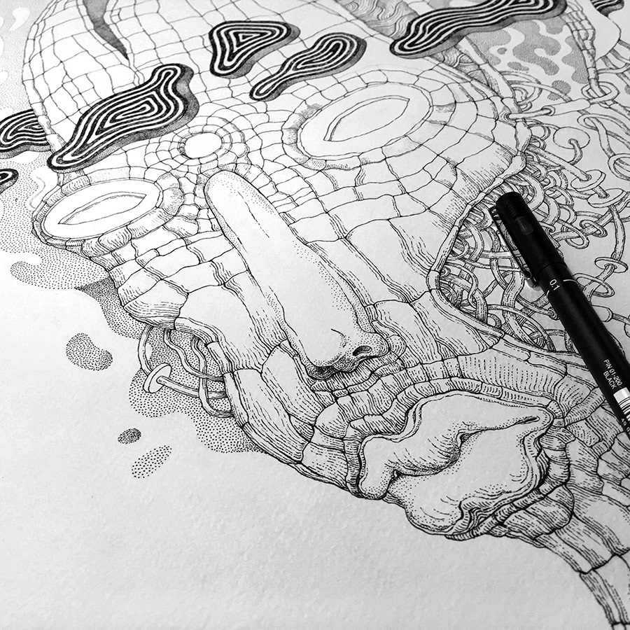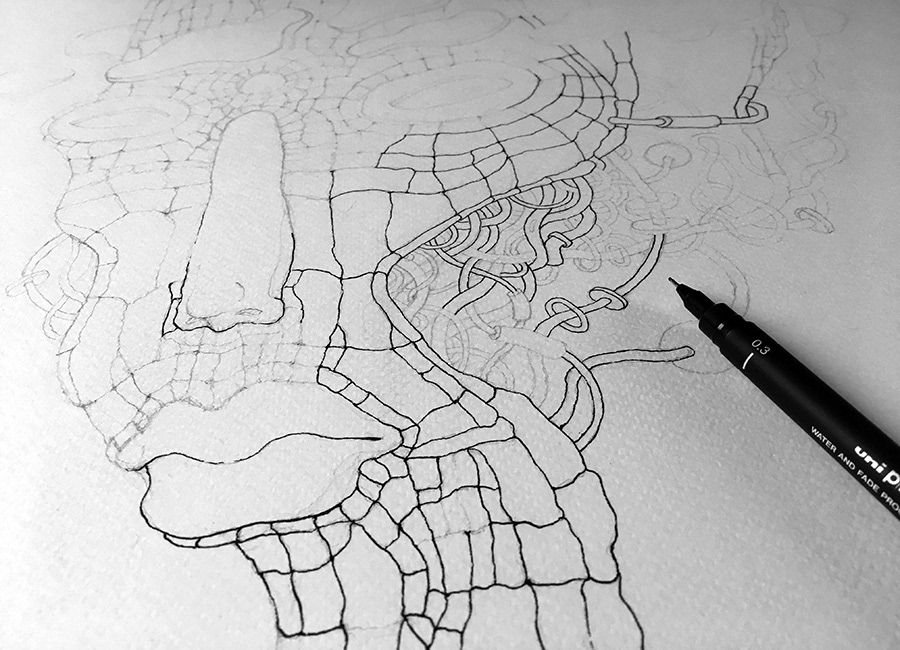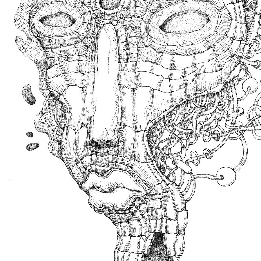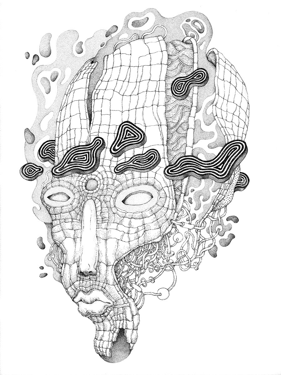 This is a part of my personal drawing project "The Masks" featuring a serie of fantasy and surreal faces/masks. Hand drawn with a brushpen and micron pens on an A2 size paper.