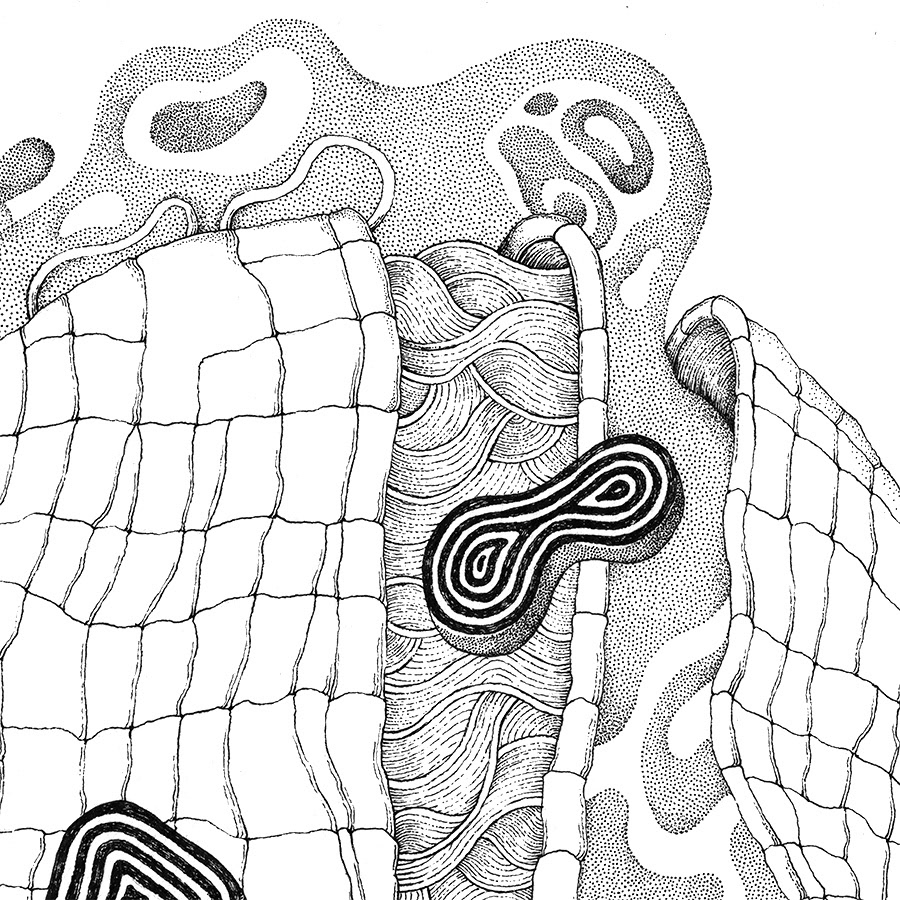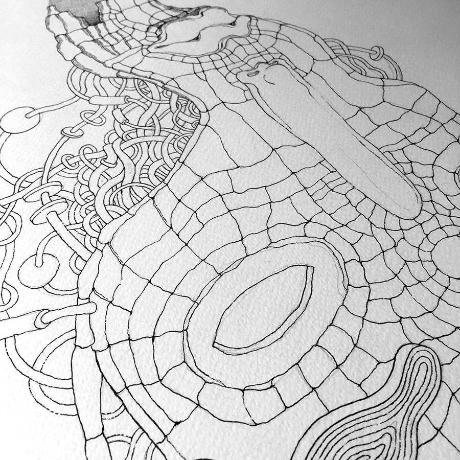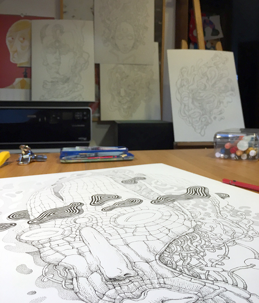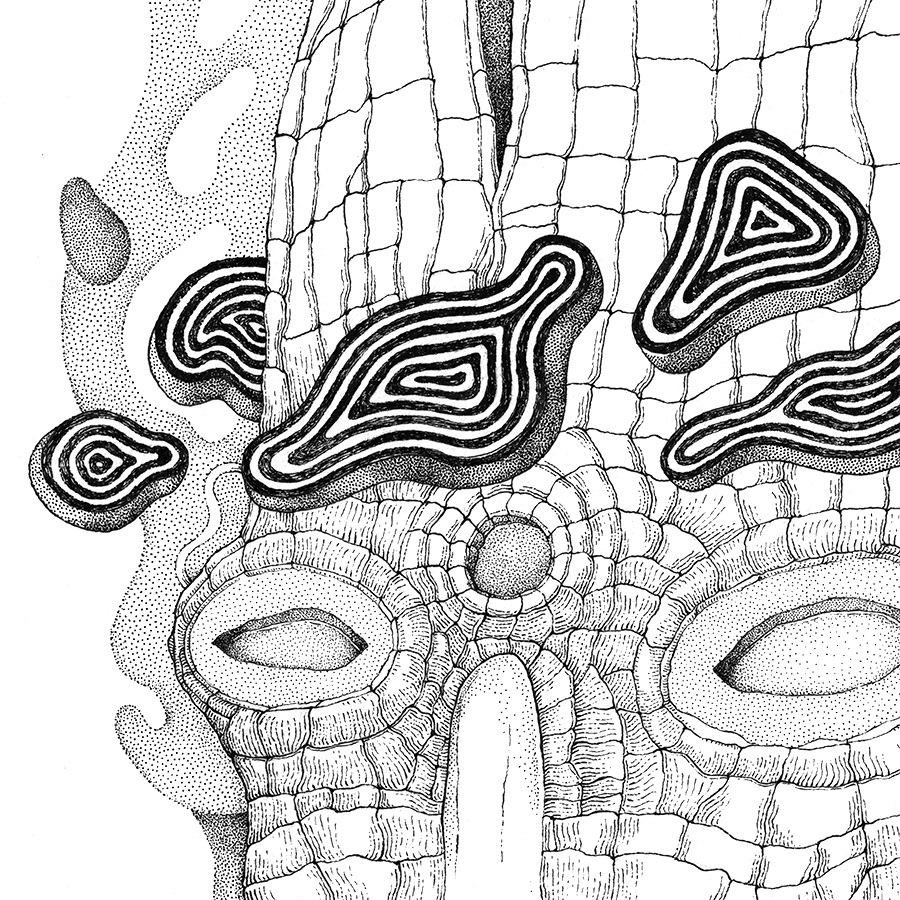 This is a part of my personal drawing project "The Masks" featuring a serie of fantasy and surreal faces/masks. Hand drawn with a brushpen and micron pens on an A2 size paper.