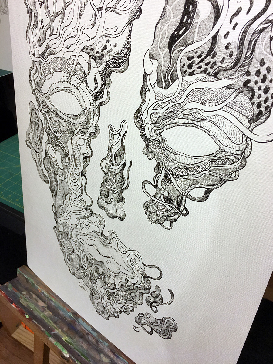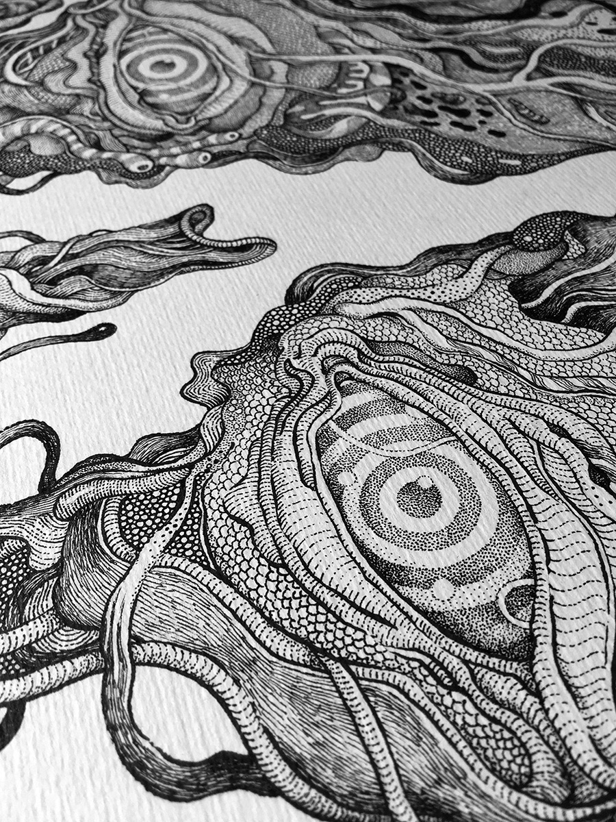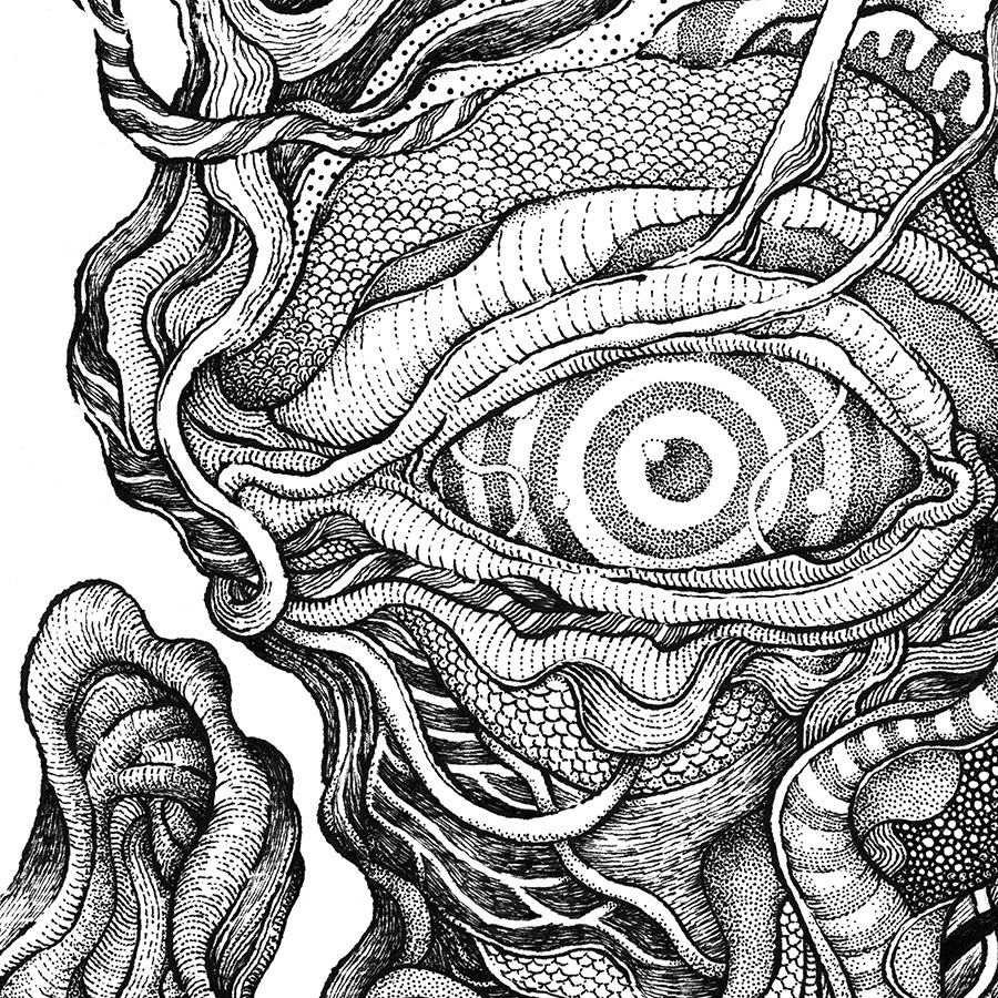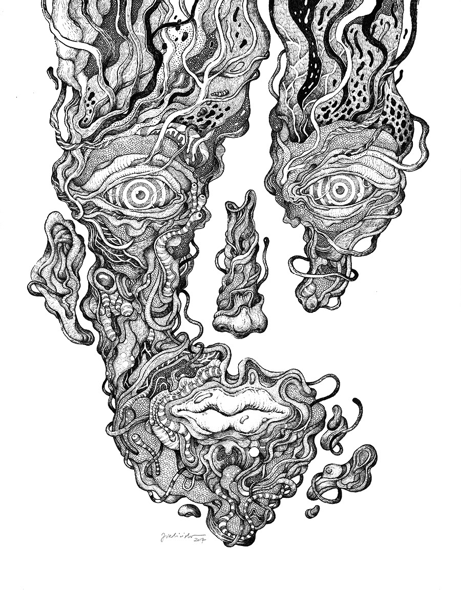 This is a part of my personal drawing project "The Masks" featuring a serie of fantasy and surreal faces/masks. Hand drawn with a brushpen and micron pens on an A2 size paper.