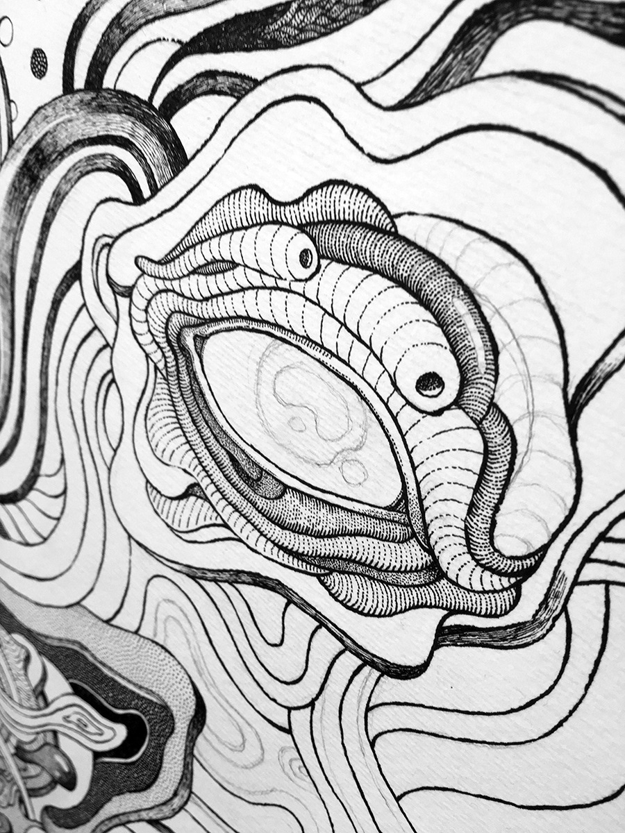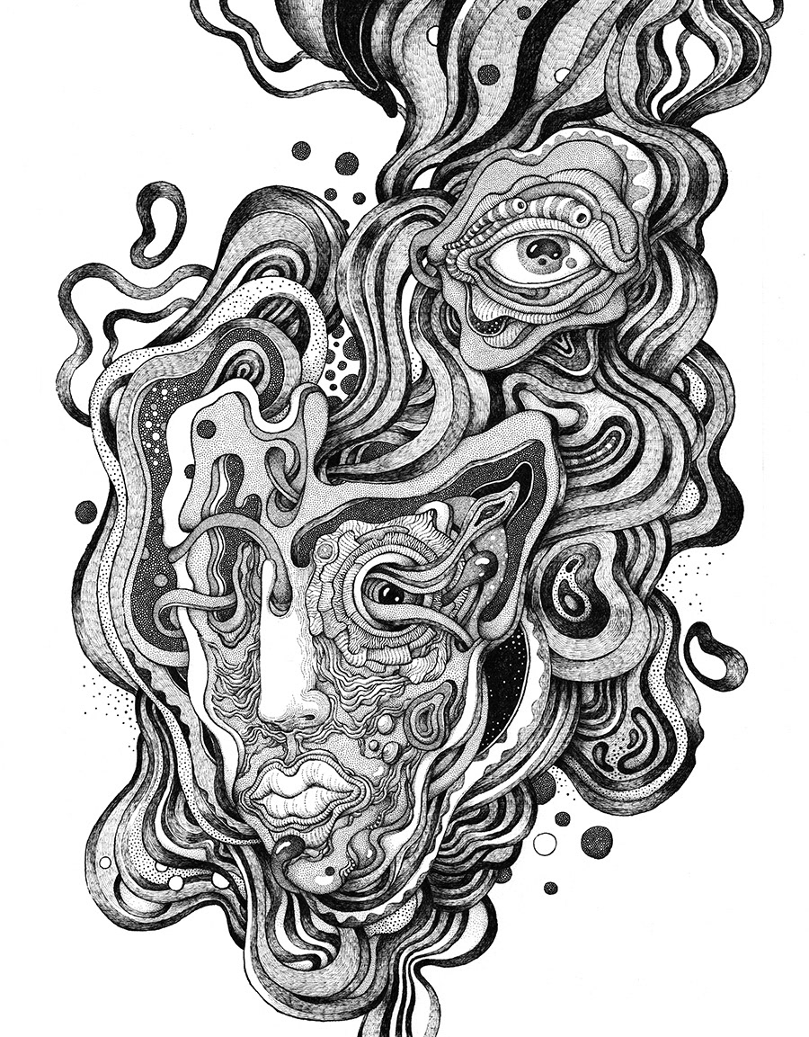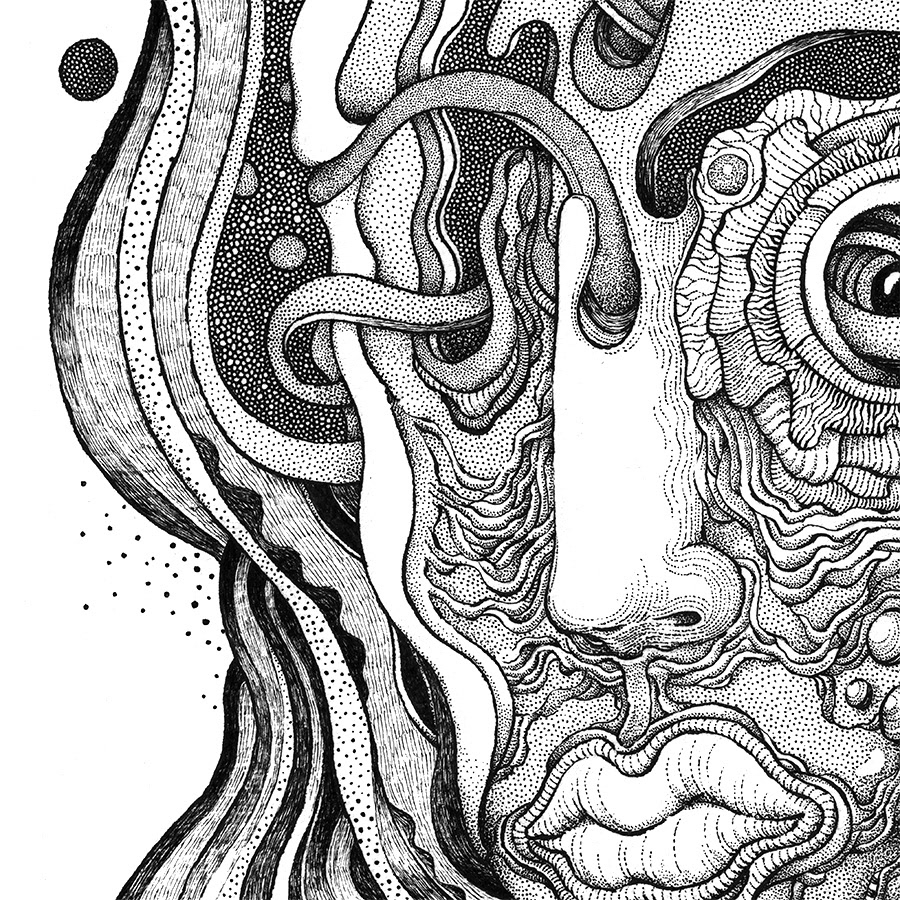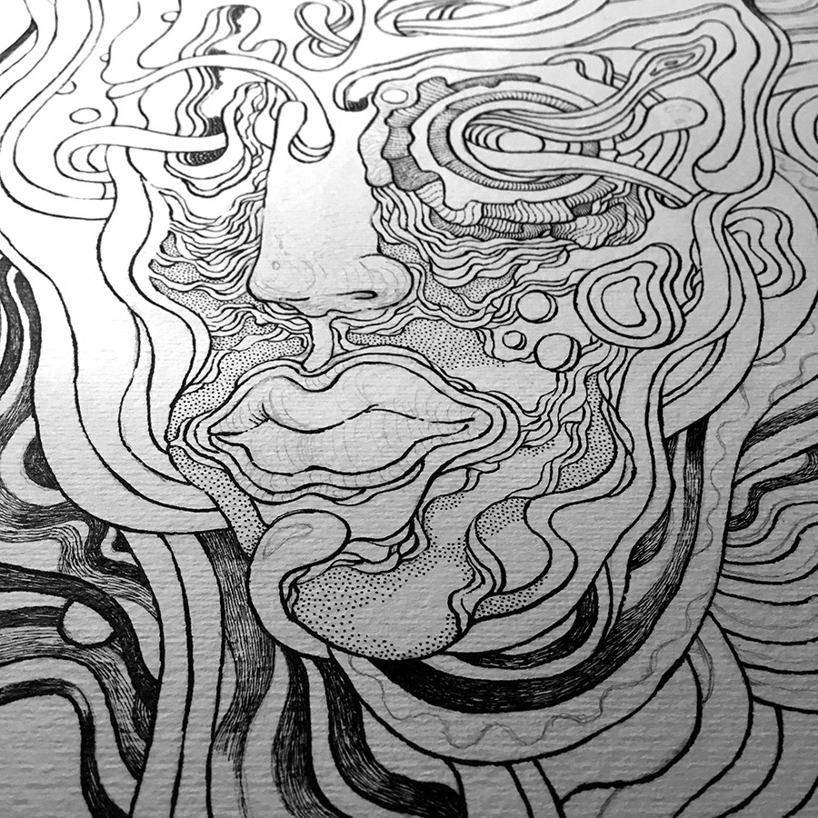 This is a part of my personal drawing project "The Masks" featuring a serie of fantasy and surreal faces/masks. Hand drawn with a brushpen and micron pens on an A2 size paper.