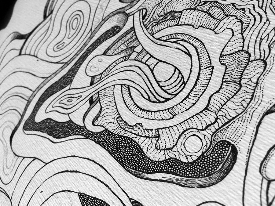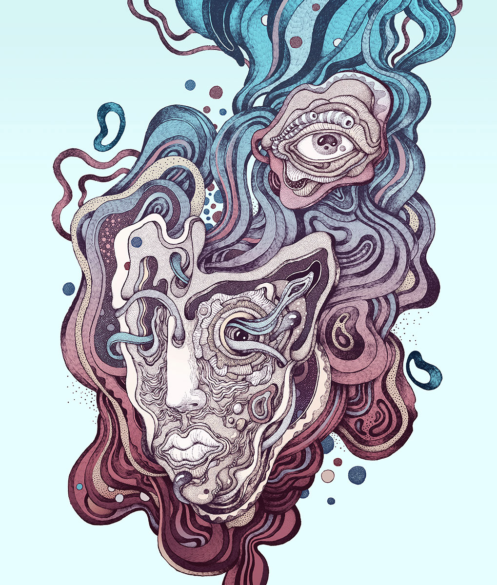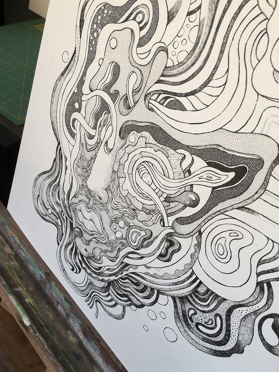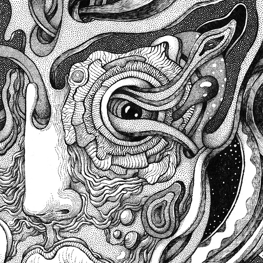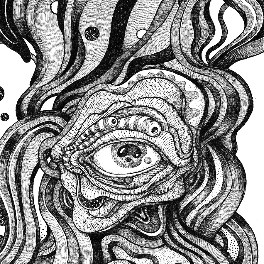 This is a part of my personal drawing project "The Masks" featuring a serie of fantasy and surreal faces/masks. Hand drawn with a brushpen and micron pens on an A2 size paper.