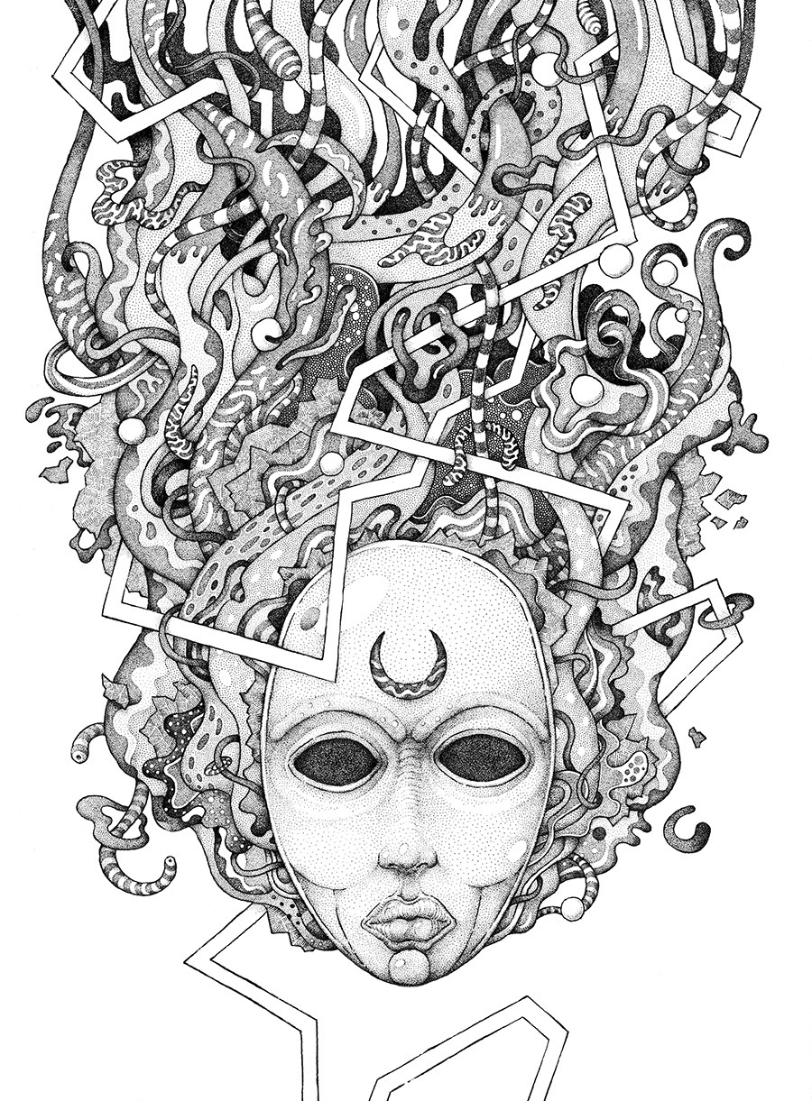 This is a part of my personal drawing project "The Masks" featuring a serie of fantasy and surreal faces/masks. Hand drawn with a brushpen and micron pens on an A2 size paper.